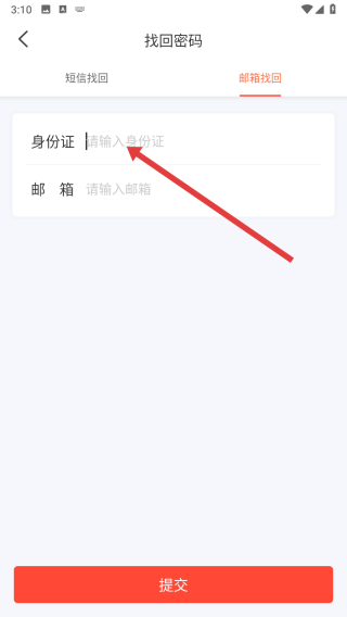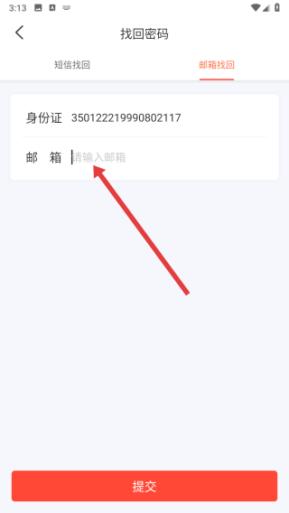 4、在填寫好身份證號后,繼續(xù)在下方填寫郵箱號碼,隨后點擊提交按鈕繼續(xù)找回操作。