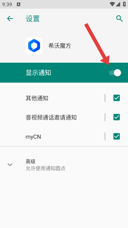 4、在消息通知設(shè)置界面,點(diǎn)擊顯示通知右側(cè)按鈕將其開啟,即可開啟消息通知。