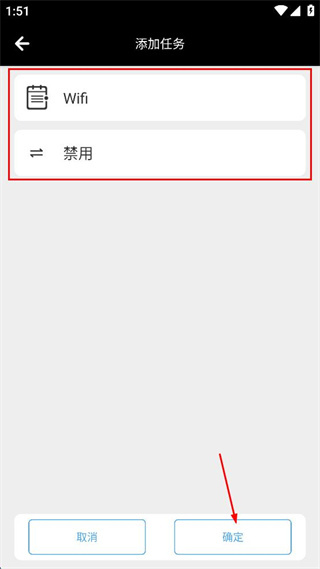 4、在添加任務(wù)頁面設(shè)置WiFi狀態(tài)為禁用,點(diǎn)擊確定,完成任務(wù)添加。