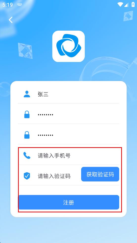 3、輸入手機(jī)號(hào),點(diǎn)擊獲取驗(yàn)證碼,輸入驗(yàn)證碼后點(diǎn)擊注冊(cè)按鈕。