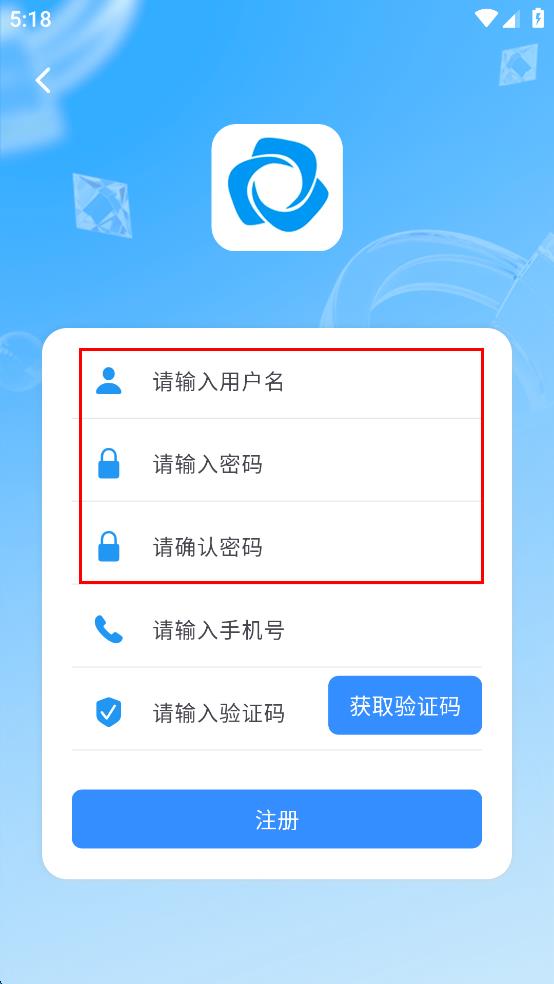 2、在注冊(cè)頁(yè)面依次輸入用戶名、密碼、確認(rèn)密碼,完成基礎(chǔ)信息填寫。