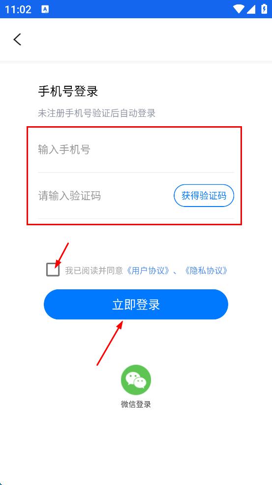 4、在手機號登錄頁面,輸入手機號,點擊“獲得驗證碼”,輸入收到的驗證碼,勾選已閱讀并同意相關協(xié)議后,點擊“立即登錄”。