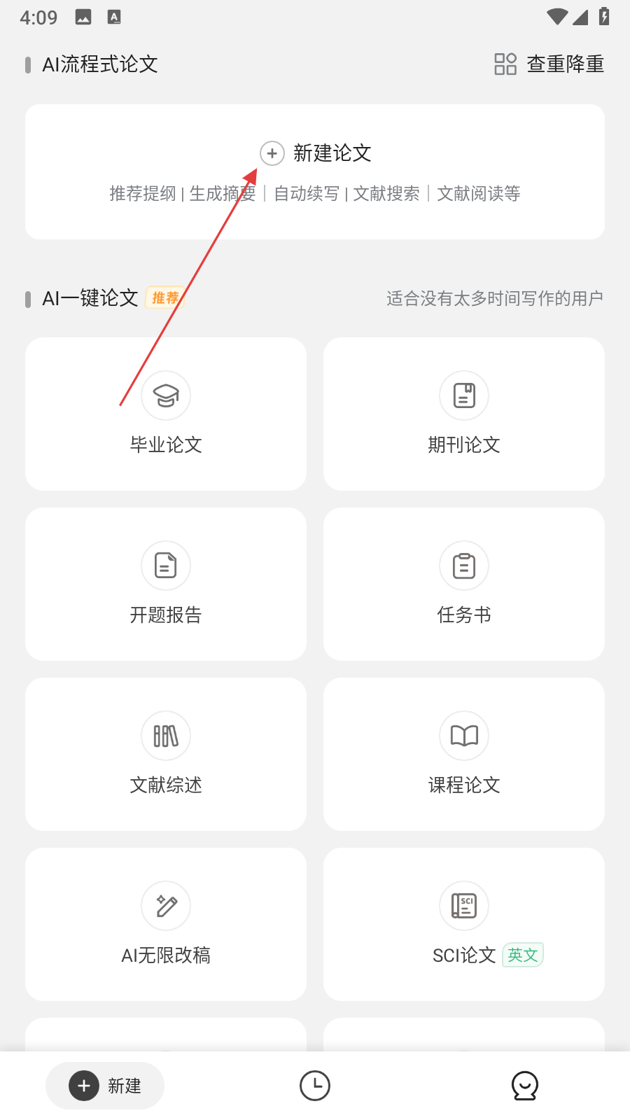 1、打開筆桿論文應用,在界面中找到新建論文按鈕并點擊。