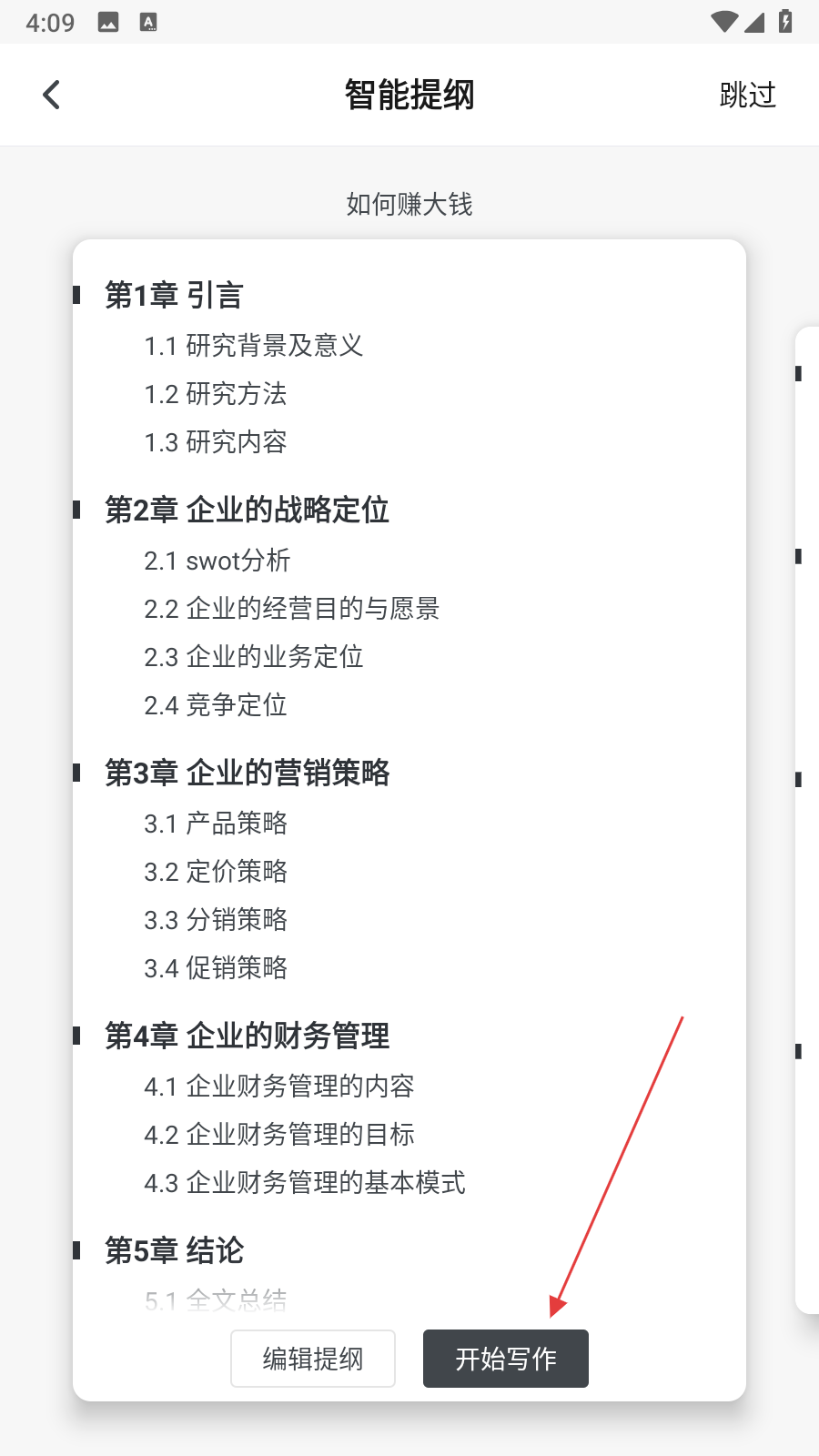 3、在智能提綱頁面,可查看系統(tǒng)自動生成的論文提綱,確認提綱后點擊開始寫作按鈕。