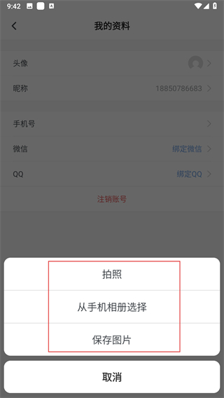 4、在頭像操作選擇框中選擇拍照或從手機相冊選擇選項即可。