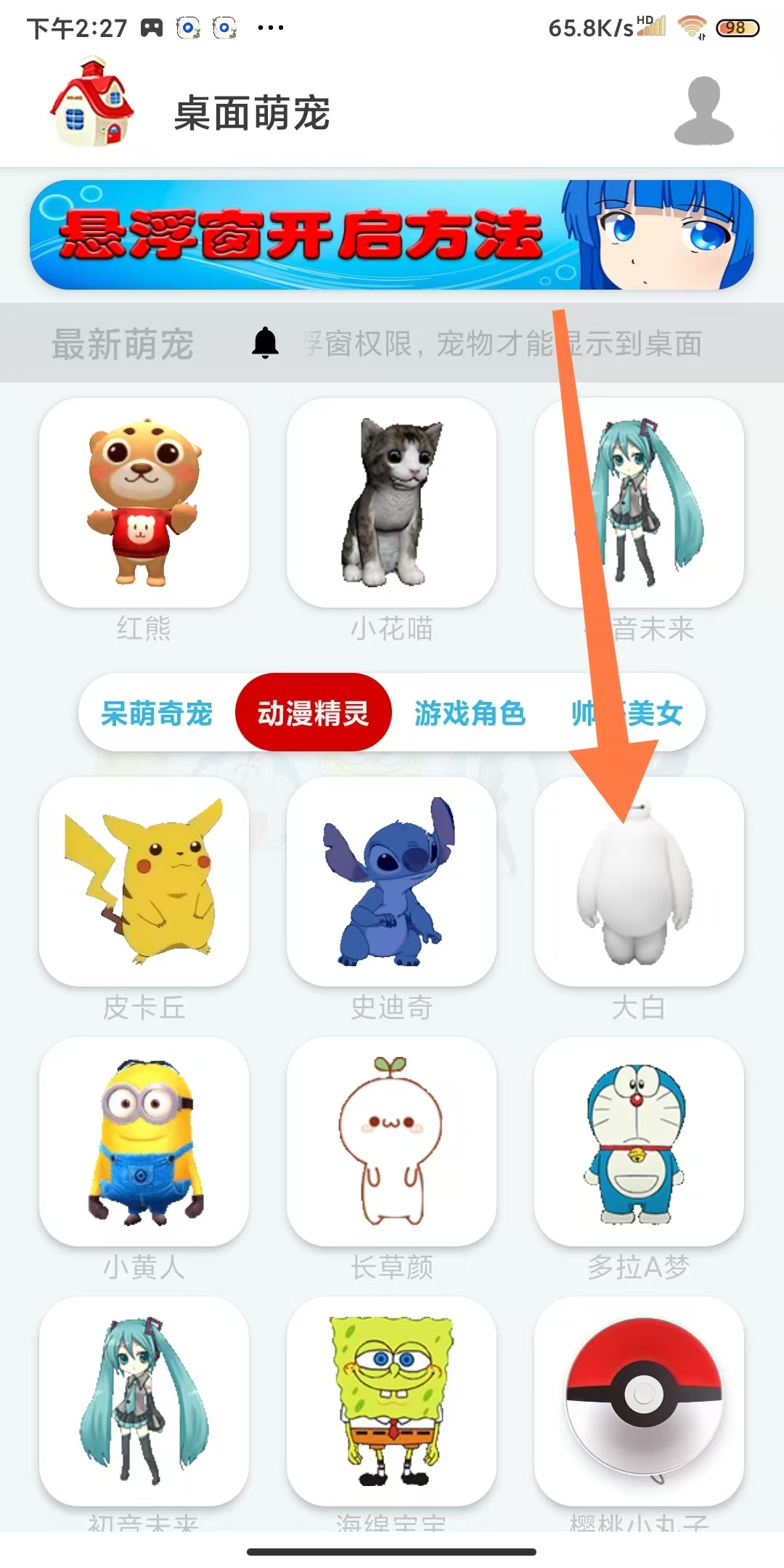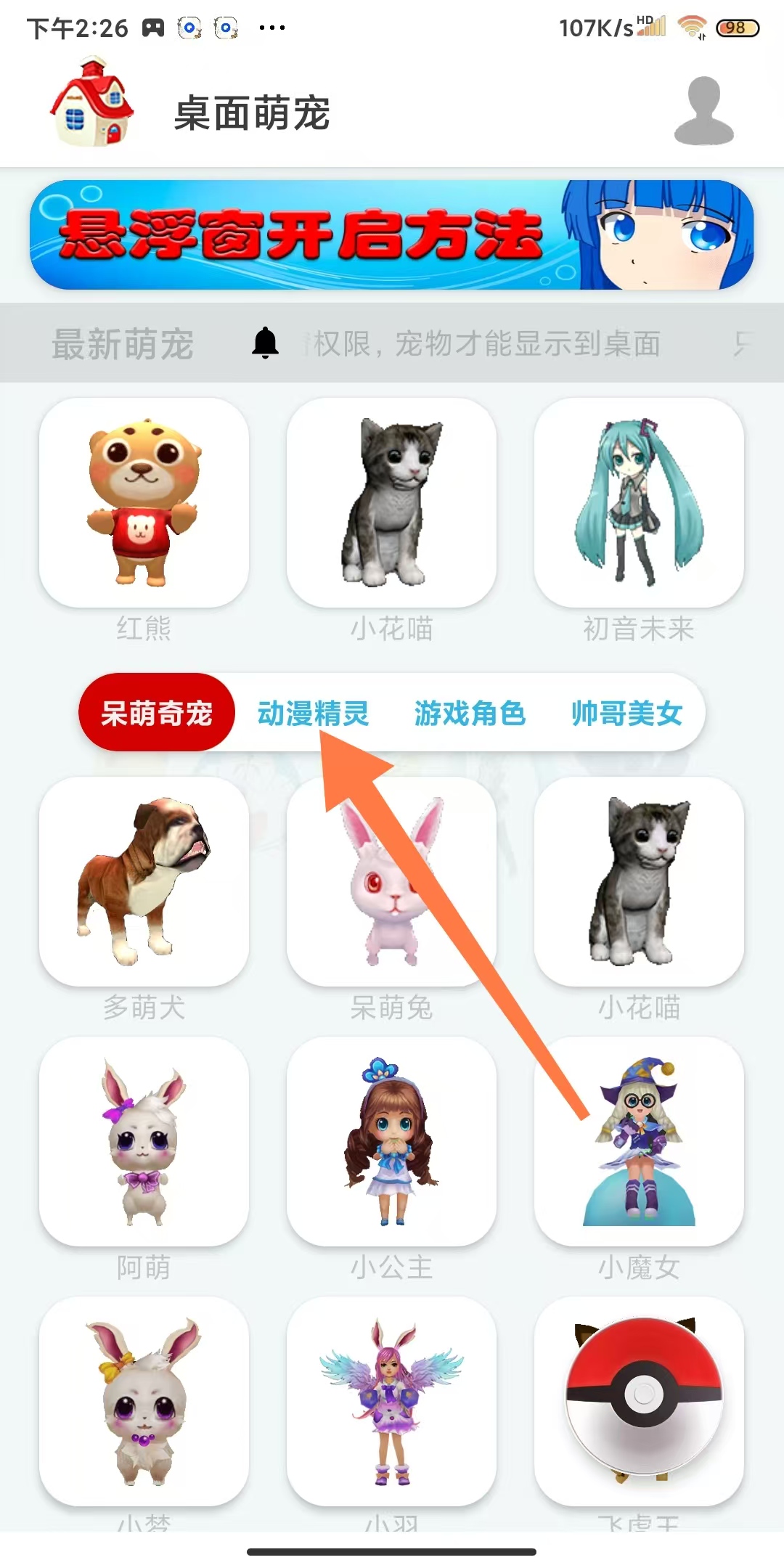 1、在桌面萌寵頁面,點擊動漫精靈分類,進入動漫精靈萌寵列表界面。