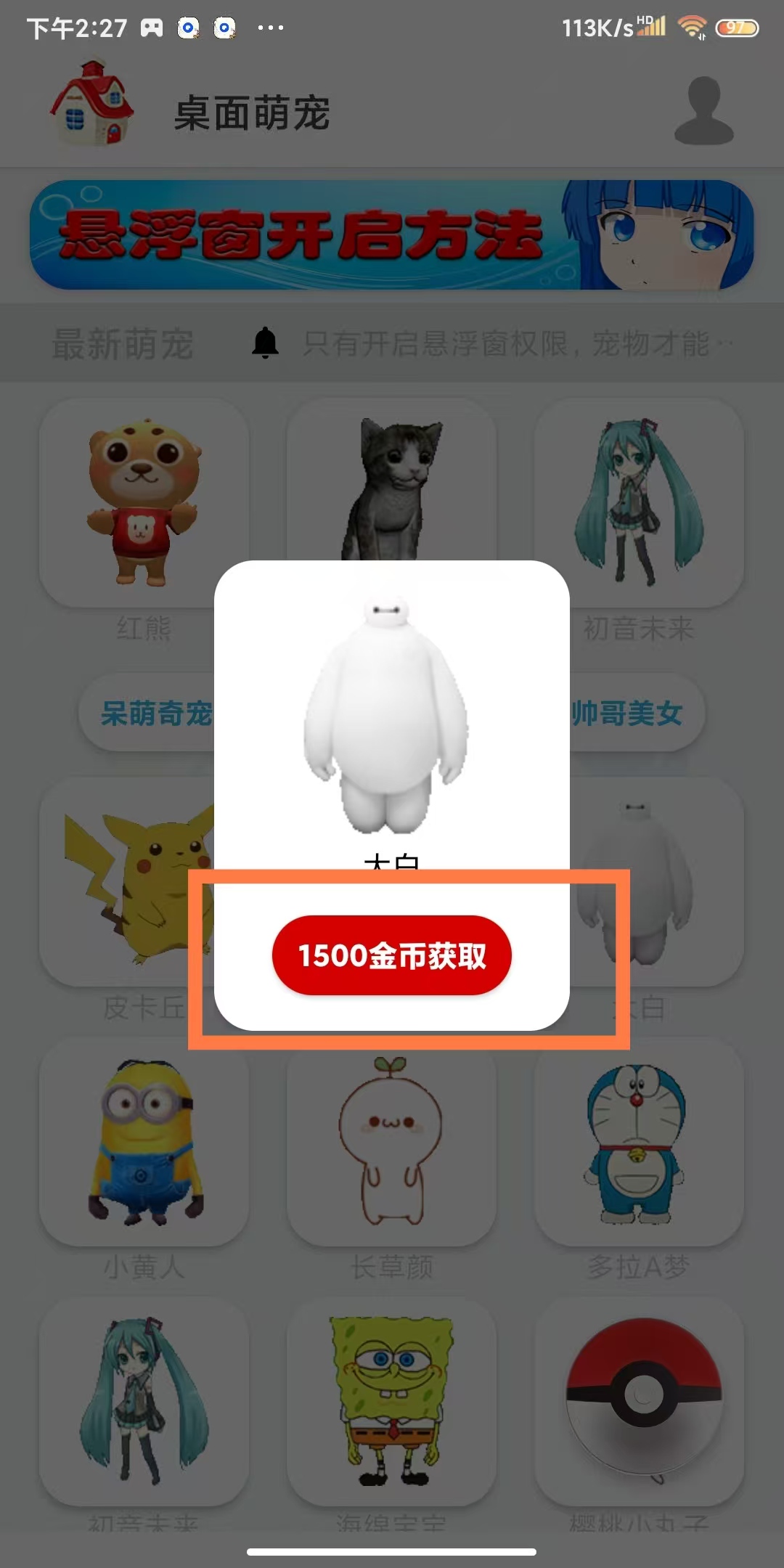 2、在動漫精靈萌寵列表界面,點擊想要設(shè)置的萌寵條目,彈出獲取提示框。