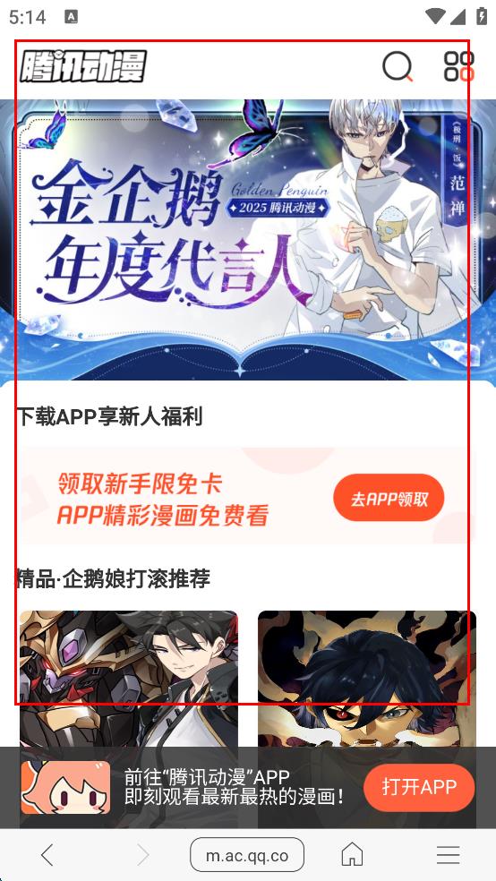 4、進(jìn)入動漫平臺頁面后,可查看平臺內(nèi)的各類動漫相關(guān)內(nèi)容,比如推薦的漫畫、活動信息等,還能根據(jù)提示下載APP,享受更多服務(wù)。