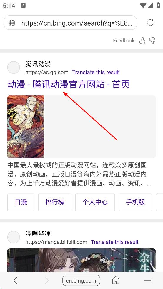 3、搜索完成后,在搜索結(jié)果頁面,找到像騰訊動漫官方網(wǎng)站這樣的動漫平臺鏈接,點(diǎn)擊該鏈接,進(jìn)入對應(yīng)的動漫平臺頁面。