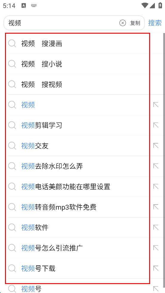 2、在搜索建議列表中,可看到“視頻搜漫畫”“視頻搜小說”等多個選項(xiàng),根據(jù)需求選擇合適的搜索建議,點(diǎn)擊進(jìn)行搜索。
