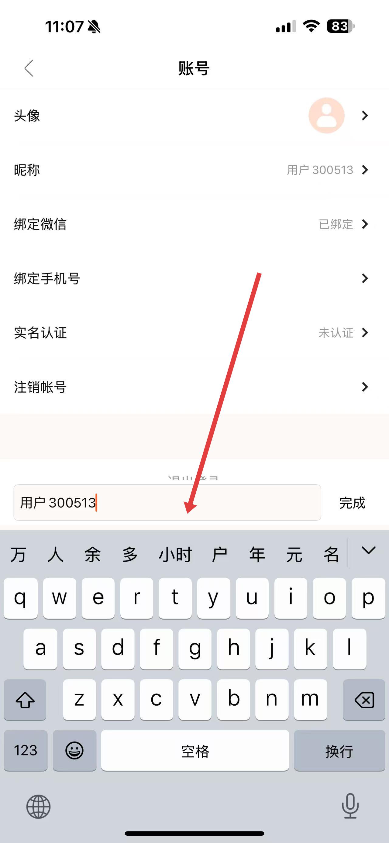 4、點(diǎn)擊昵稱選項(xiàng),在彈出的輸入框中刪除原有昵稱,輸入新昵稱后點(diǎn)擊完成,即可完成昵稱修改。