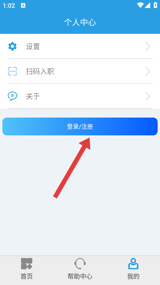 1、進(jìn)入個(gè)人中心的頁面,我們需要先點(diǎn)擊藍(lán)色的登錄/注冊按鈕,開啟賬號(hào)的登錄或注冊流程。