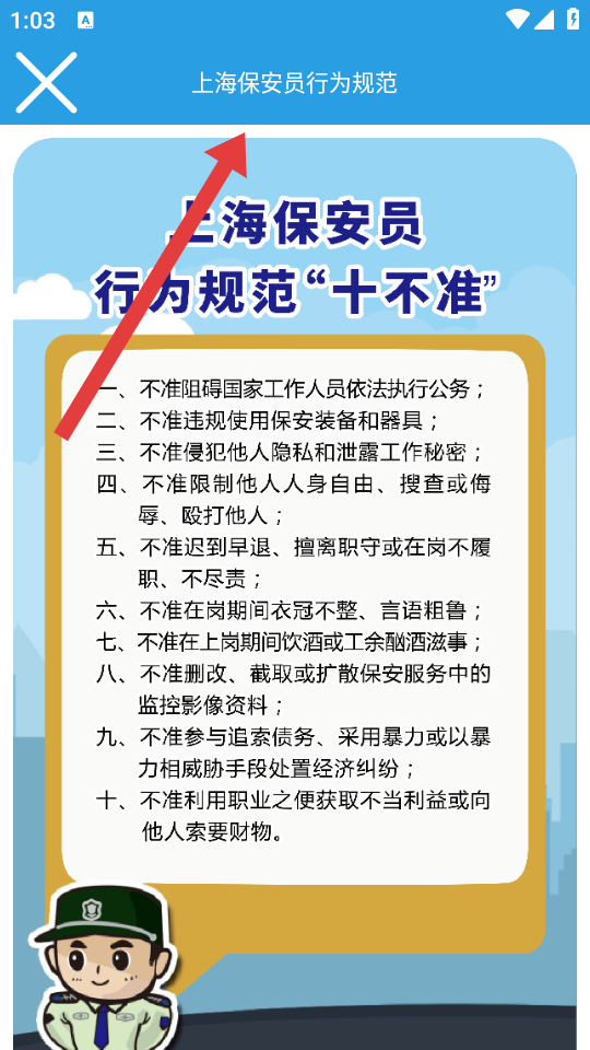 3、打開上海保安員行為規(guī)范的詳情頁,開始查看上海保安員行為規(guī)范十不準(zhǔn)等職業(yè)行為準(zhǔn)則內(nèi)容。