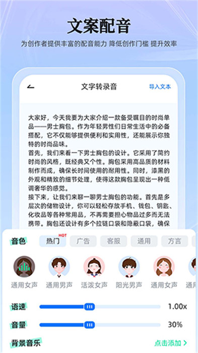 提供文字轉(zhuǎn)換語(yǔ)音功能,可對(duì)語(yǔ)音進(jìn)行個(gè)性化調(diào)整,還能選擇語(yǔ)音主播,甜美女聲、洪亮男聲、可愛(ài)童聲隨意切換。生成的語(yǔ)音支持導(dǎo)出,方便在其他場(chǎng)景使用。