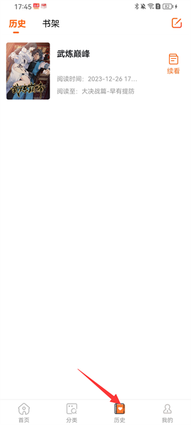 4、點擊歷史欄目,就能查看我們的所有的閱讀歷史,若是沒看完,可以點擊右邊的“續(xù)看”,即可接著之前的界面繼續(xù)瀏覽。