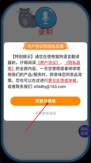 1、打開貓狗語言翻譯器APP,點擊同意并繼續(xù),進入主界面。