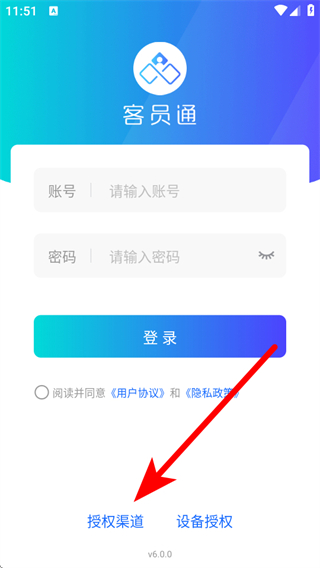 1、打開客員通APP,需要在登錄頁面點擊授權(quán)渠道。