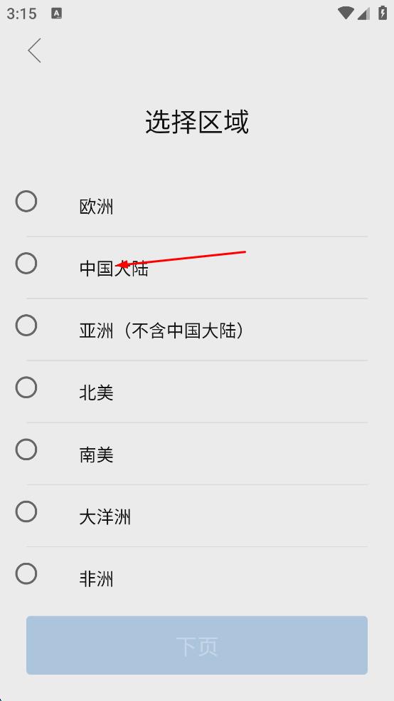 2、在“選擇區(qū)域”頁面,選擇“中國大陸”選項,點擊“下頁”,進入賬號登錄界面 。