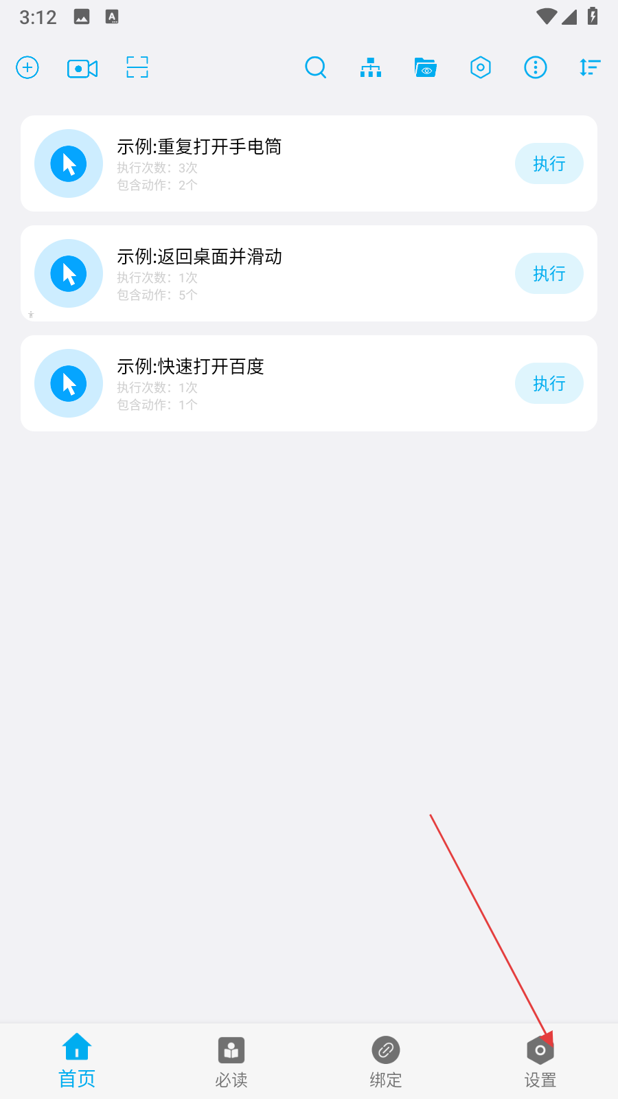 1、打開免Root自動化助手應(yīng)用,點擊底部導(dǎo)航欄最右側(cè)設(shè)置選項,進入設(shè)置頁面。