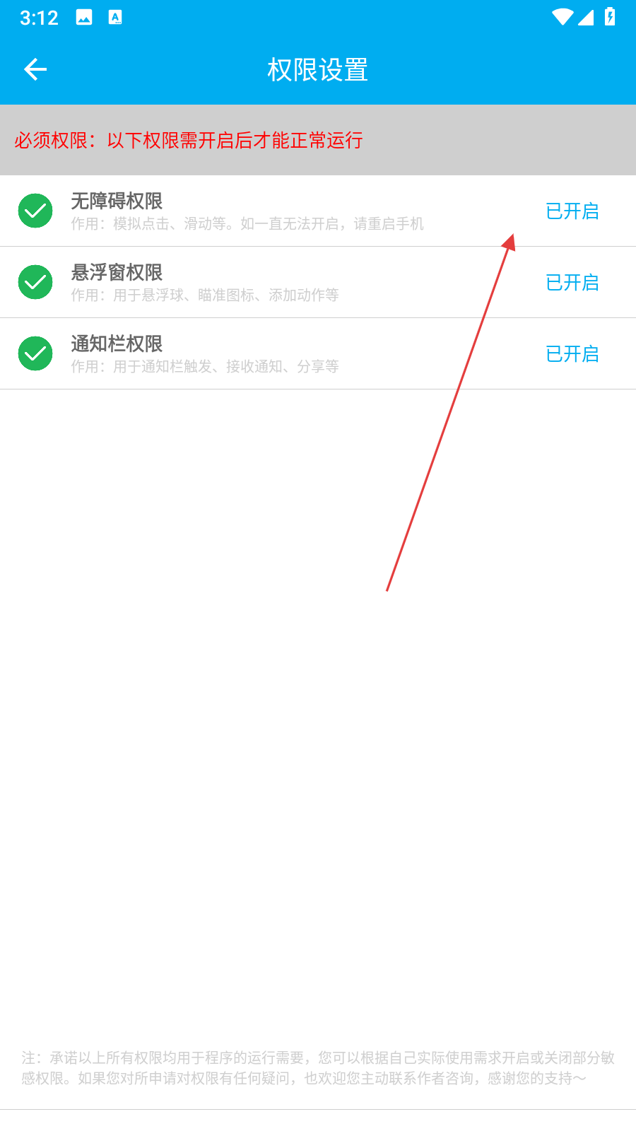 3、在權(quán)限設(shè)置界面中,查看無障礙權(quán)限,懸浮窗權(quán)限,通知欄權(quán)限等必須權(quán)限的開啟狀態(tài),若未開啟則點擊對應(yīng)權(quán)限進行開啟,確保應(yīng)用正常運行。