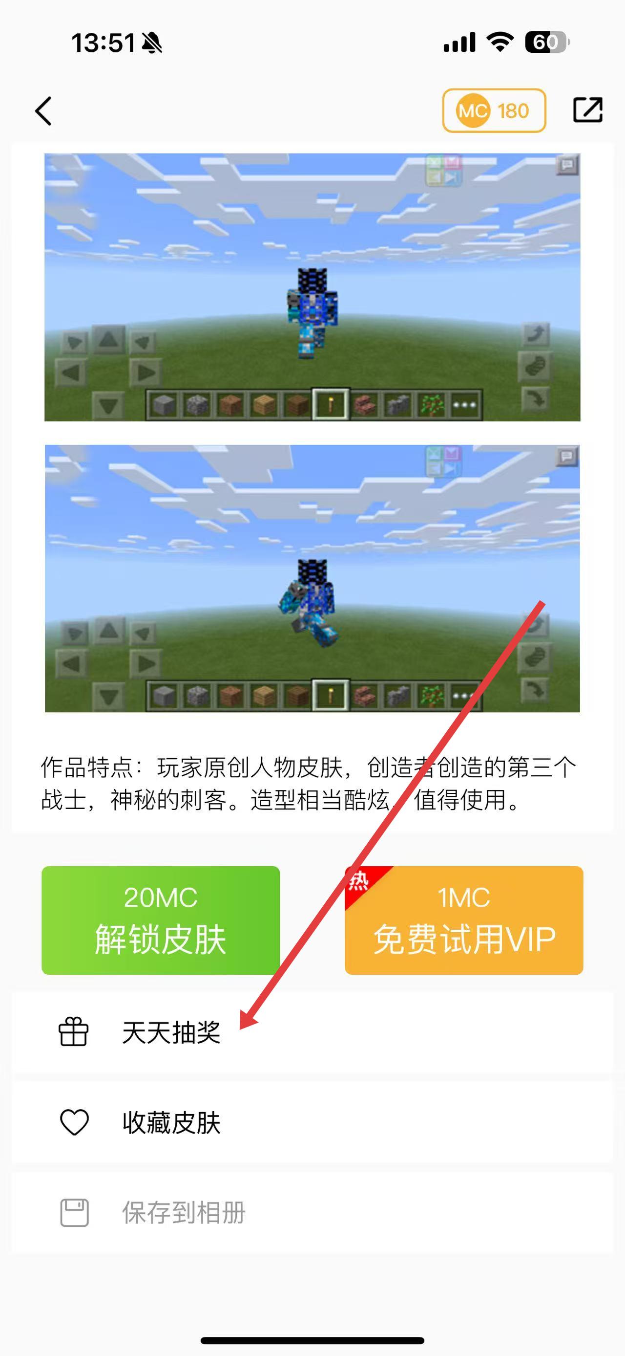 3、進(jìn)入所選皮膚詳情頁后,點擊下方天天抽獎選項獲取抽獎機(jī)會。