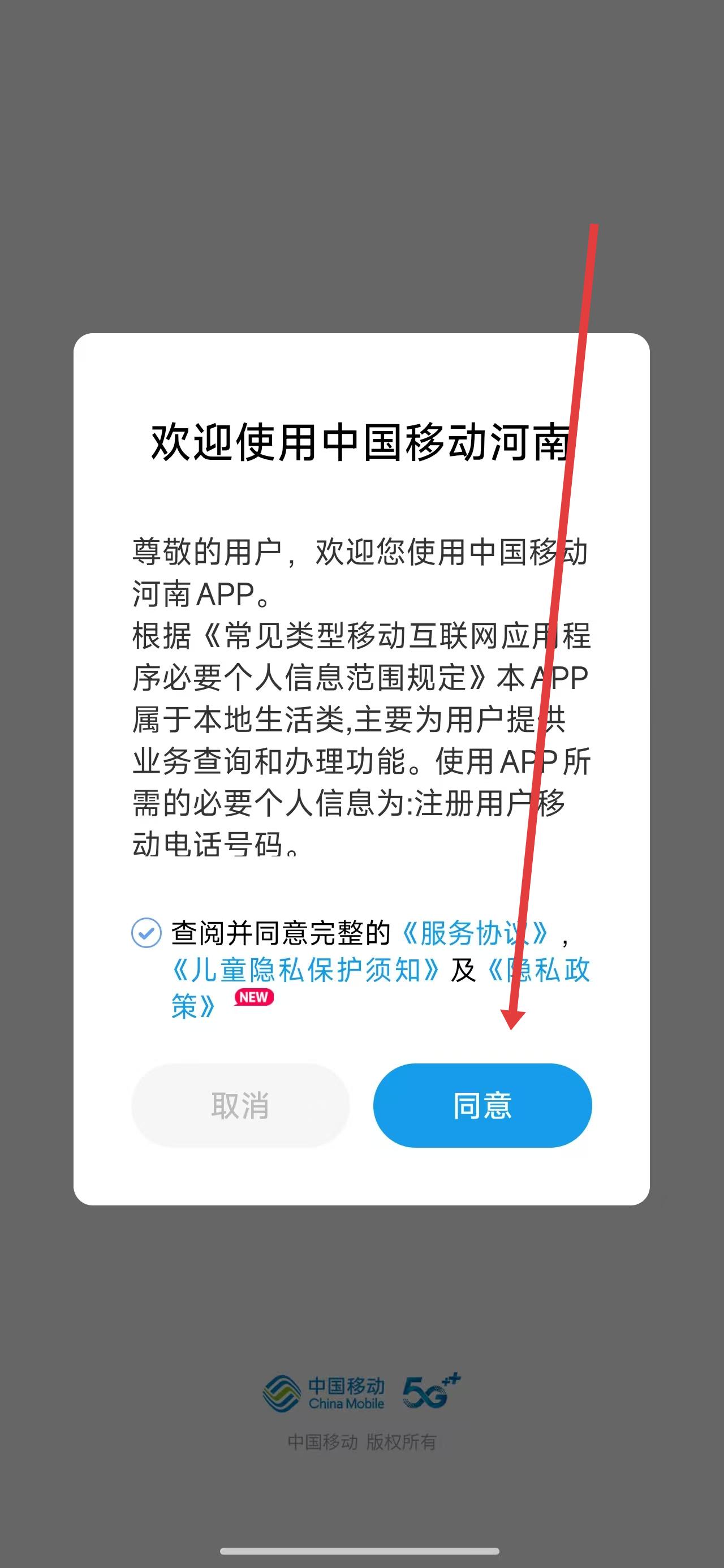 1、打開中國(guó)移動(dòng)河南app后,可以點(diǎn)擊彈窗中的同意按鈕,進(jìn)入使用。