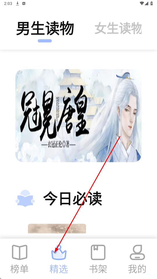 1、打開閱讀APP,點擊底部導(dǎo)航欄中間的精選圖標(biāo),進(jìn)入內(nèi)容推薦頁,頁面頂部設(shè)男生讀物、女生讀物切換標(biāo)簽,當(dāng)前展示男生讀物分區(qū),含書籍封面、今日必讀模塊。