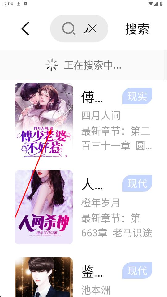 2、點擊頁面頂部搜索欄,輸入關(guān)鍵詞后觸發(fā)搜索,找到《傅少老婆不好惹》條目左側(cè)顯書籍封面,右側(cè)標(biāo)注現(xiàn)實分類、作者四月人間、最新章節(jié)信息,點擊該條目進(jìn)入書籍詳情頁。