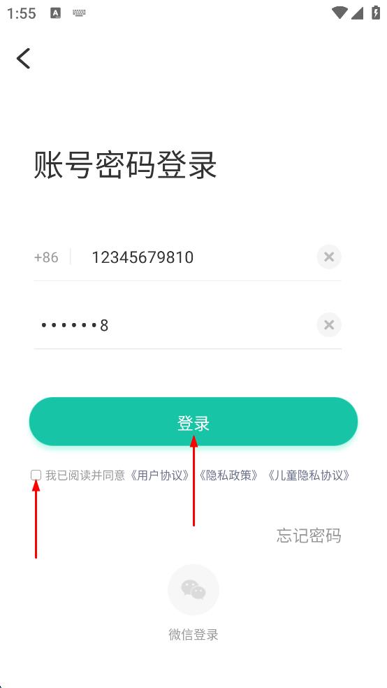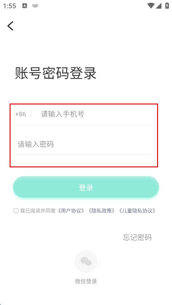4、填寫好手機(jī)號(hào)和密碼后,勾選“我已閱讀并同意用戶協(xié)議,隱私政策,兒童隱私協(xié)議選項(xiàng),然后點(diǎn)擊“登錄”按鈕,即可嘗試登錄掌心寶貝app。
