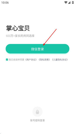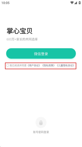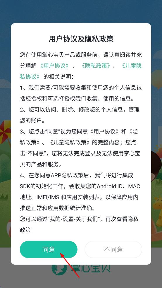 1、打開(kāi)掌心寶貝軟件,看到用戶協(xié)議及隱私政策彈窗,點(diǎn)擊綠色的同意按鈕,進(jìn)入登錄界面。