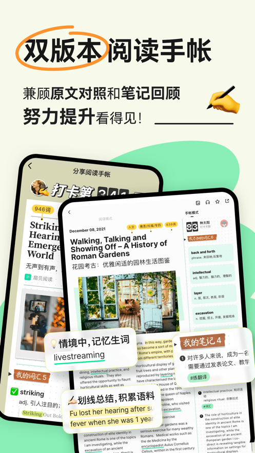閱讀中的生詞可以即時(shí)添加到自己的學(xué)習(xí)計(jì)劃中,利用扇貝強(qiáng)大的記憶系統(tǒng)進(jìn)行學(xué)習(xí)。