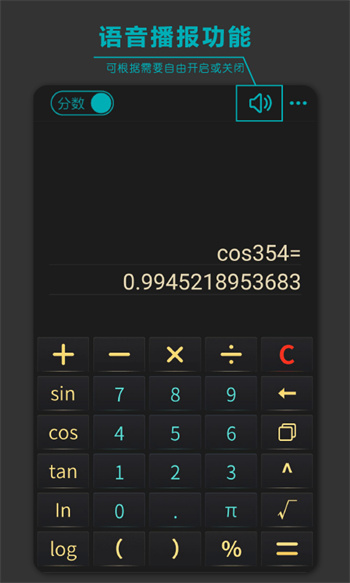 本應(yīng)用提供分?jǐn)?shù)計算,支持語音播報,還支持普通的加減乘除計算,以及根號計算,另外可以單獨(dú)計算一些高級算法。