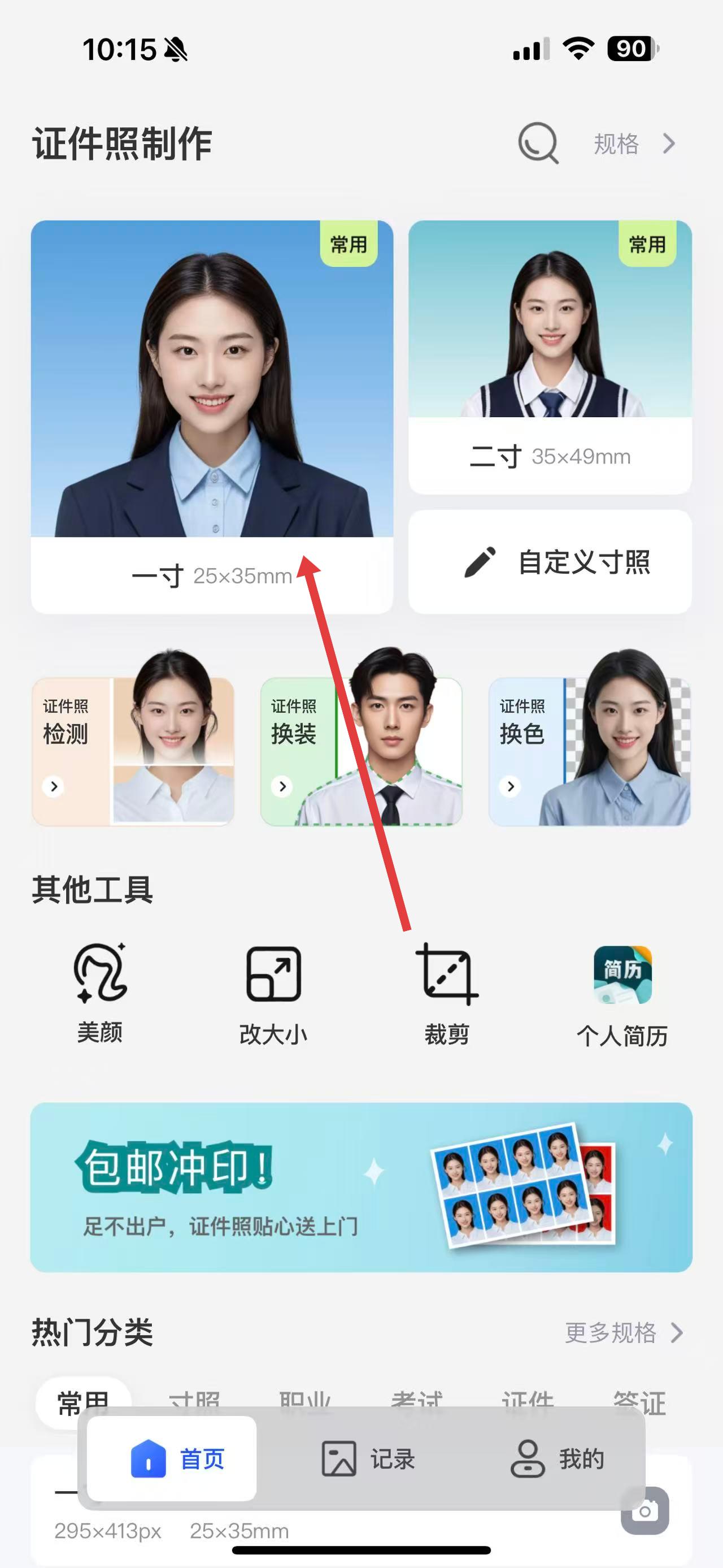 1、進入美妝相機的證件照制作界面,在常用欄里,點擊如一寸25x35mm這類所需的證件照規(guī)格。