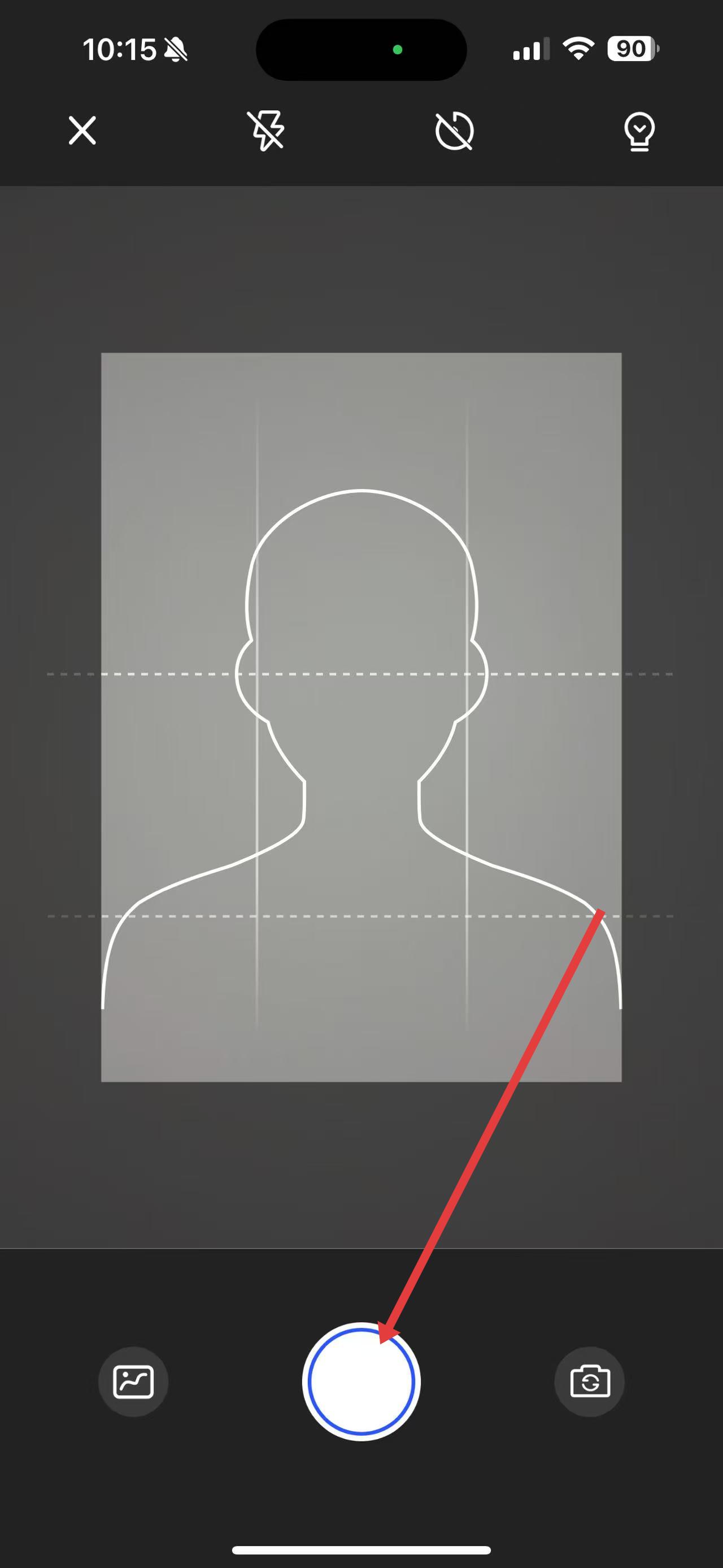 3、進入拍攝界面后,根據(jù)輪廓提示調(diào)整姿勢和位置,然后點擊底部的拍攝按鈕完成拍攝,后續(xù)按提示操作保存證件照即可。
