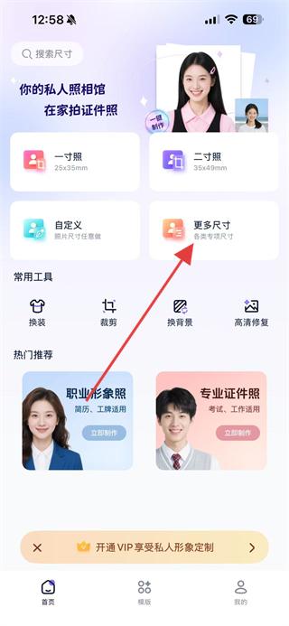 1、打開證件照制作應(yīng)用,點擊更多尺寸選項,進入尺寸選擇頁面。