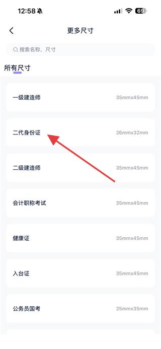 2、在所有尺寸列表中,點擊二代身份證選項,進入制作證件照頁面。