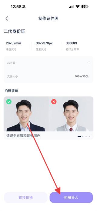 3、在制作證件照頁面,點擊相冊導(dǎo)入按鈕,選擇要制作的照片。