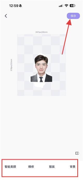4、照片導(dǎo)入后,可利用智能美顏、精修、服裝、背景等功能進行調(diào)整,完成后點擊保存即可制作好免費證件照。