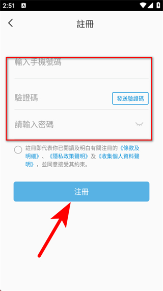 4、在注冊的頁面,輸入手機(jī)號(hào)碼等信息后點(diǎn)擊注冊,完成注冊。