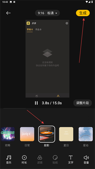 3、進入剪輯的頁面內(nèi),選擇成片后點擊右上生成按鈕即可。