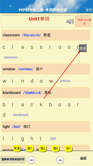3、進入單詞點讀頁面后,點擊右側(cè)目錄按鈕。