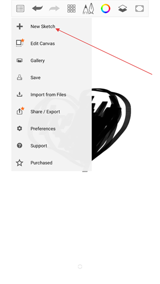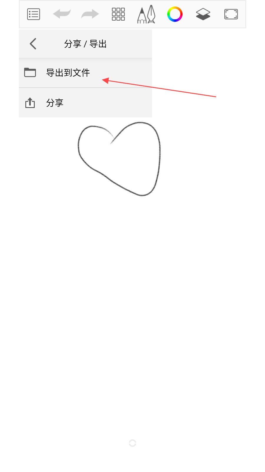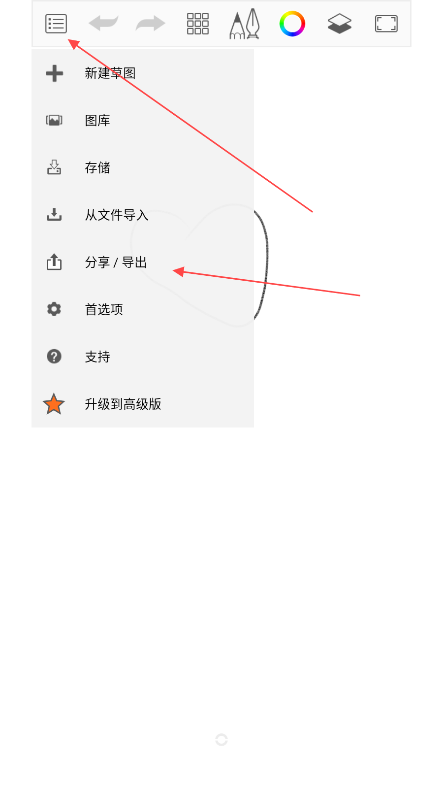 1、在Sketchbook軟件中完成繪圖后,點(diǎn)擊界面上方的菜單圖標(biāo),在彈出的下拉菜單中,點(diǎn)擊分享/導(dǎo)出選項(xiàng)。