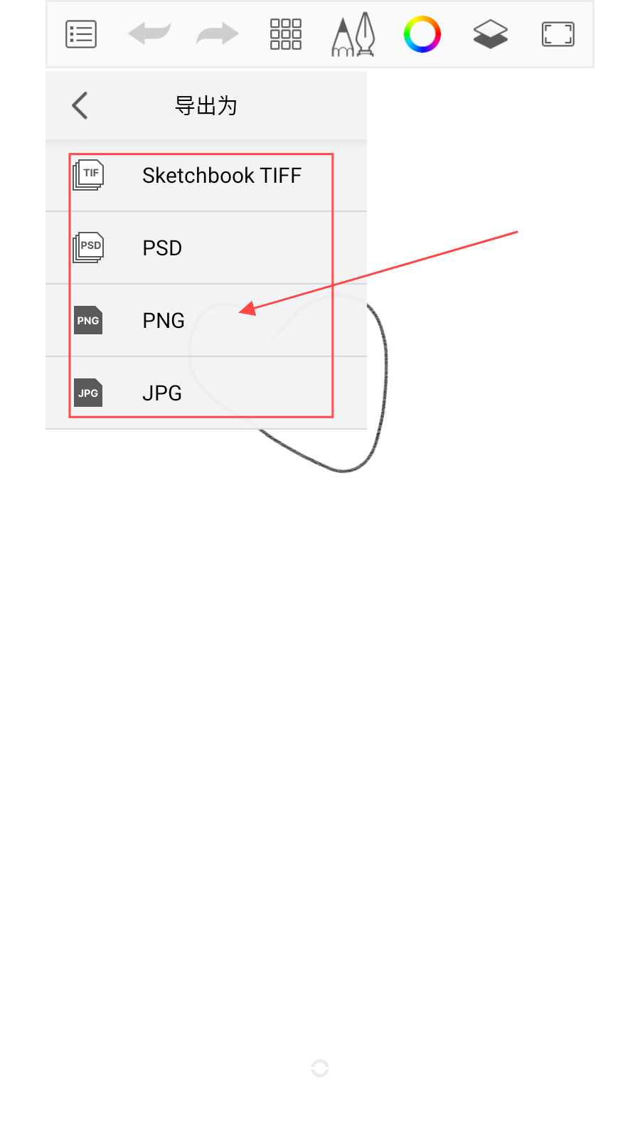 3、在導(dǎo)出為界面,選擇想要保存的圖片格式,如PNG、JPG等,選擇完成后,軟件會(huì)將圖片保存到手機(jī)默認(rèn)的存儲(chǔ)位置,進(jìn)而保存到相冊(cè)中。