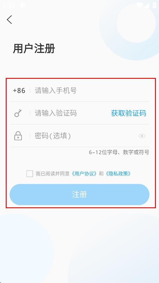 4、在用戶注冊(cè)頁(yè)面,輸入手機(jī)號(hào),點(diǎn)擊“獲取驗(yàn)證碼”,待收到驗(yàn)證碼后輸入到對(duì)應(yīng)框中,選填密碼,勾選我已閱讀并同意用戶協(xié)議和隱私政策,點(diǎn)擊“注冊(cè)”按鈕,完成賬號(hào)注冊(cè)。