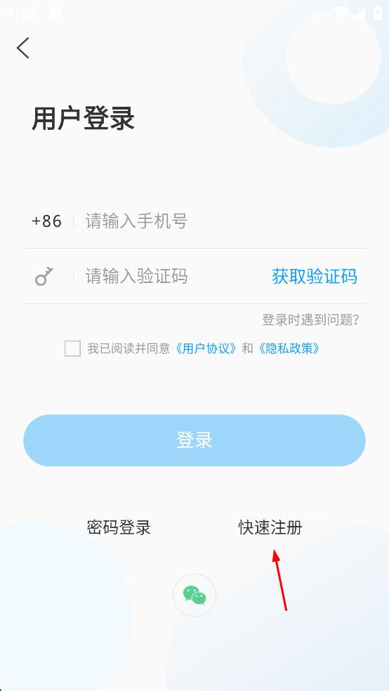 3、在用戶登錄頁(yè)面,點(diǎn)擊“快速注冊(cè)”選項(xiàng),進(jìn)入用戶注冊(cè)頁(yè)面。