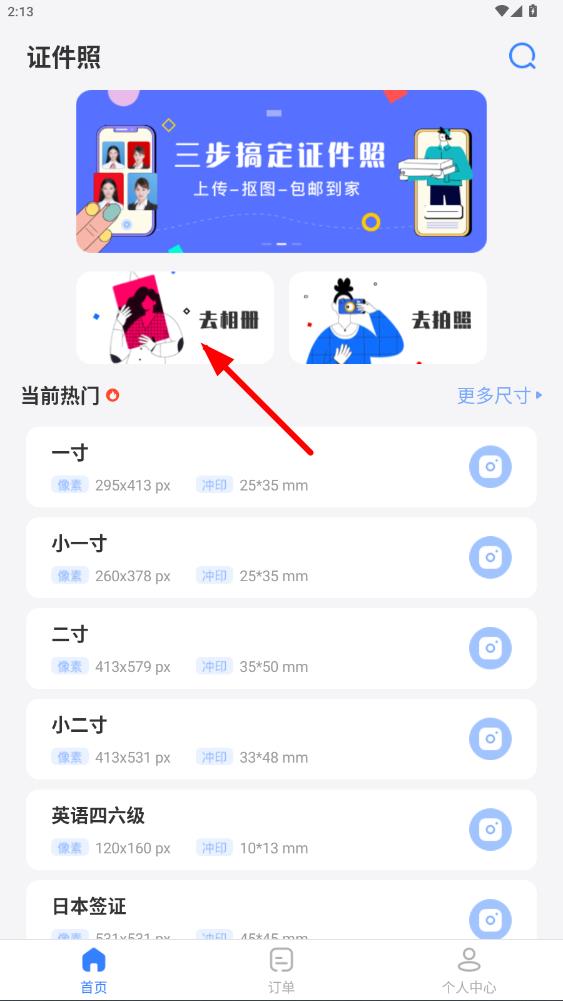 1、打開寸照拍攝APP進入證件照界面,點擊去相冊選擇已有照片。