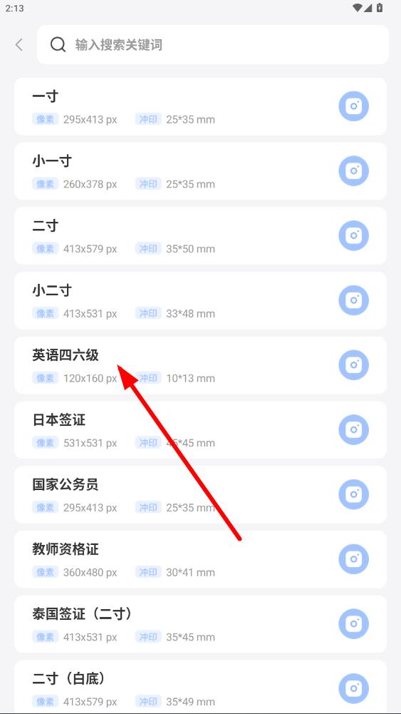 2、在尺寸列表里,找到并選擇需要的證件照尺寸,比如英語四六級尺寸。