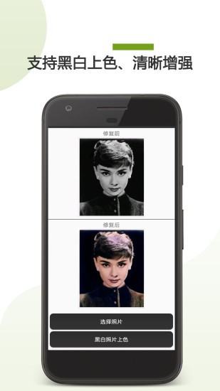 ai照片修復(fù)app可以在線智能修復(fù)老舊照片,是很受網(wǎng)友喜愛(ài)的老照片修復(fù)軟件,可以一鍵修復(fù)破損的老照片,還可以給黑白照片上色哦。軟件提供了智能化的人工智能摳圖、編輯等功能。此外,軟件提供多樣的修圖功能,操作簡(jiǎn)便,即使是新手用戶也能輕松上手。需要的用戶歡迎安裝。