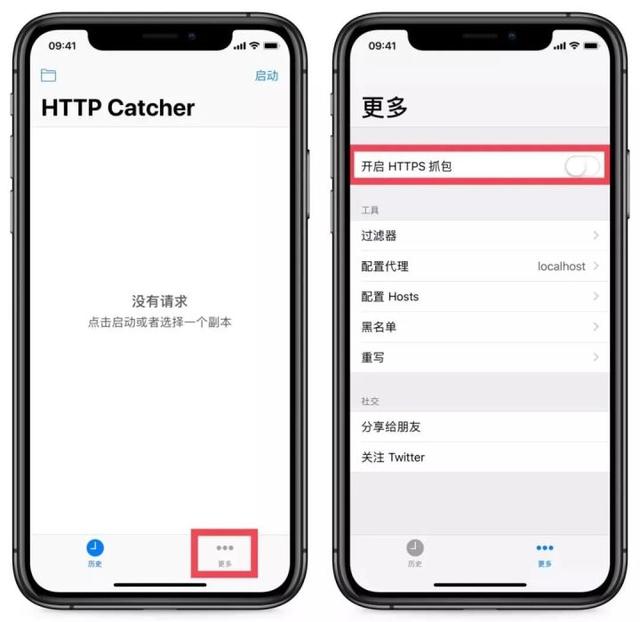http catcher第一次使用需要配置彈出的證書(shū)和描述文件證書(shū)安裝:更多--打開(kāi)HTTPS抓包--安裝。