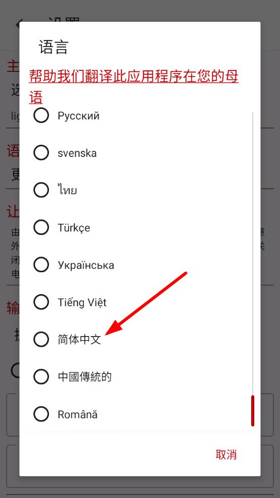3、在語言選擇列表里,點擊選中簡體中文選項,即可將應(yīng)用語言設(shè)置為中文。